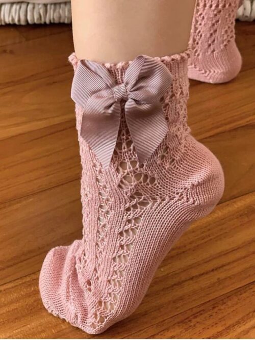 Șosete scurte roz pudră din tricot, fundă laterală, Condor