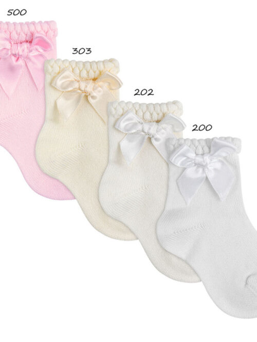 Șosete din bumbac de ceremonie cu fundă asortată. ALB-200 IVORY-303 ROZ-500