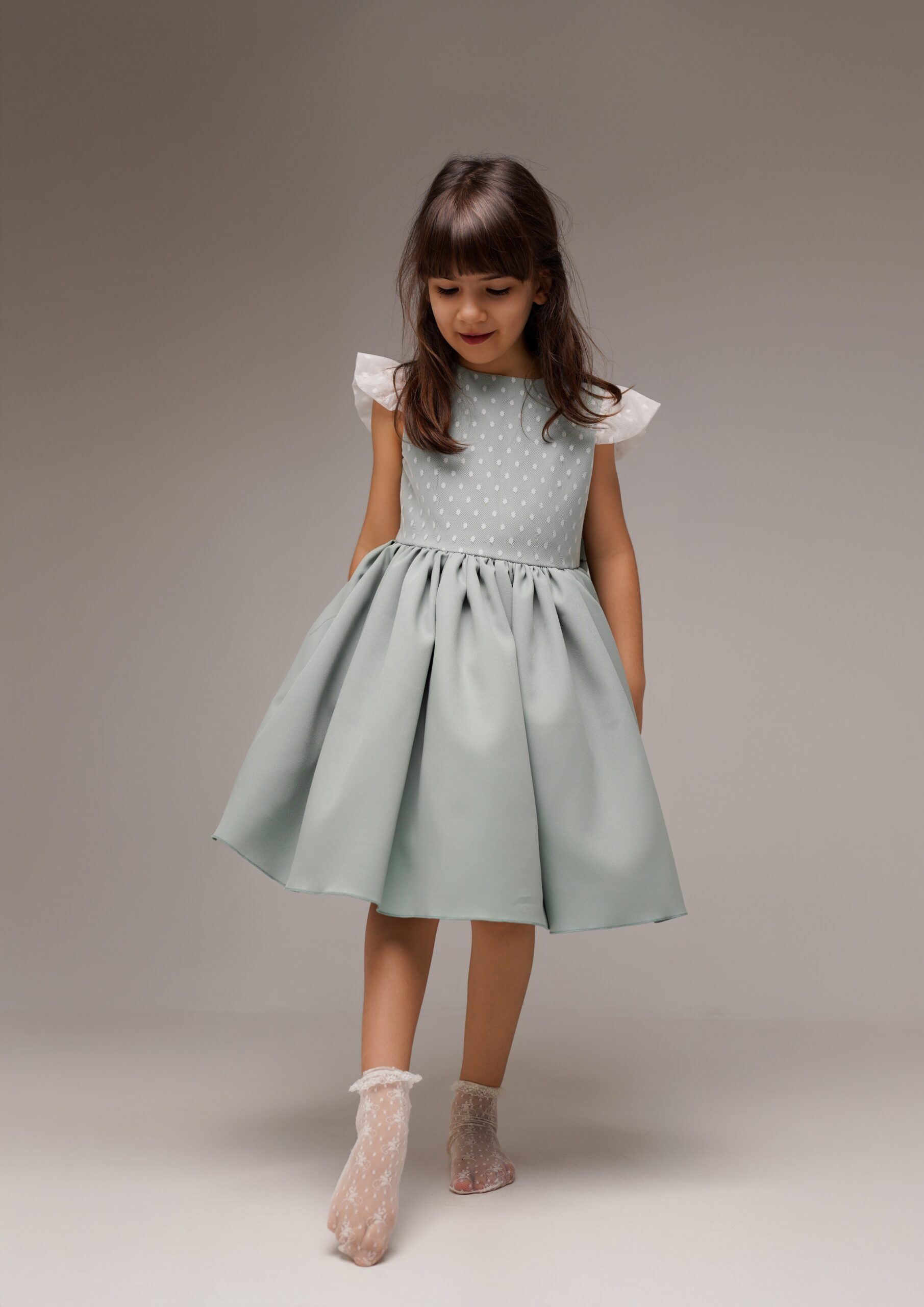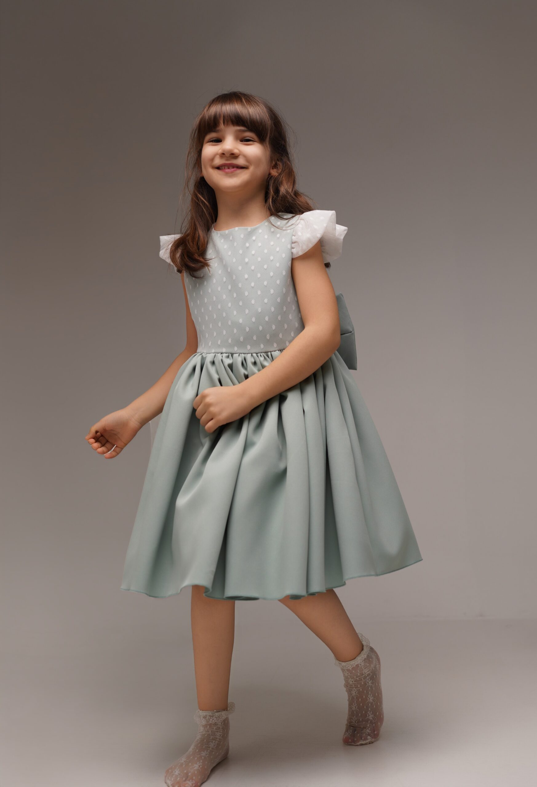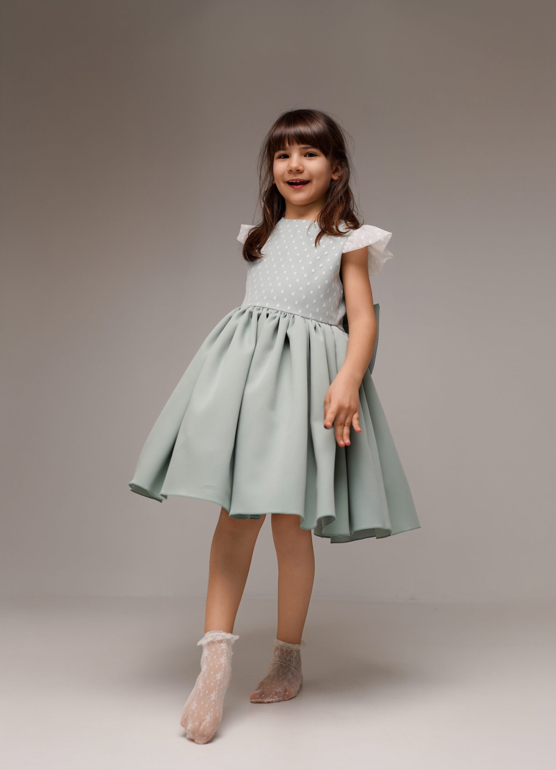 Rochiță elegantă pentru fetițe, realizată într-o nuanță delicată de verde mentă, perfectă pentru evenimente speciale. Partea superioară este confecționată din material texturat,plasa fina, cu buline fine, completată de mânecuțe ușor bufante din tulle alb, care oferă un aspect delicat și rafinat. Talia este accentuată de o fundă mare decorativă in partea din spate, ce adaugă un plus de eleganță și farmec. Fusta amplă, cu pliuri frumoase, oferă volum și libertate de mișcare, transformând rochița într-o alegere ideală pentru aniversări, botezuri, petreceri sau ședințe foto.