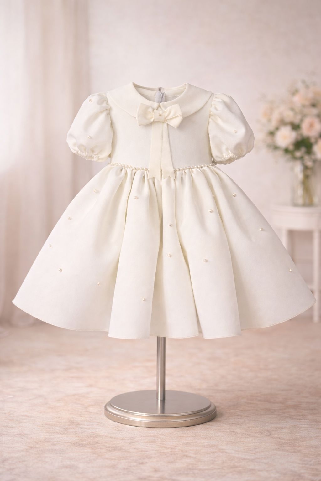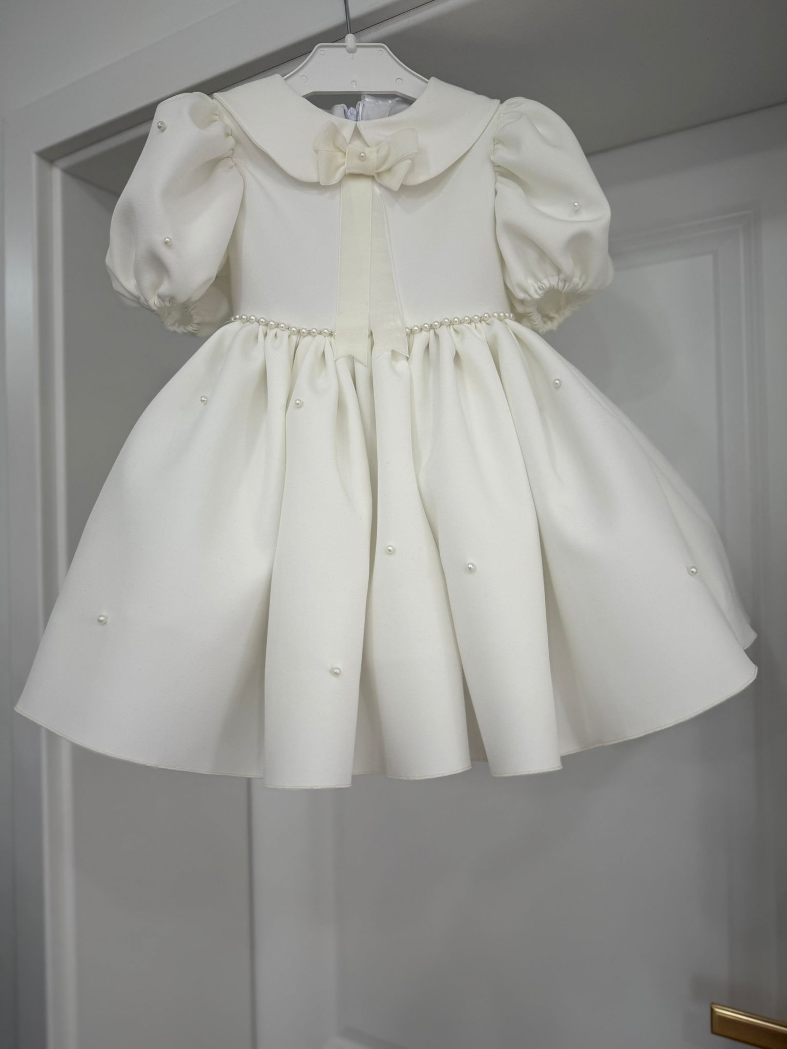 Rochie din stofă, cu interior din bumbac, confortabilă și plăcută la purtare. Design clasic cu guler rotunjit, mâneci bufante și detalii tip perlă. Croială amplă, ideală pentru botez, ceremonii și evenimente speciale.
