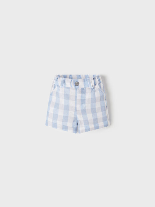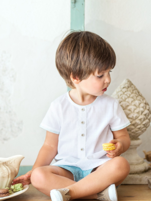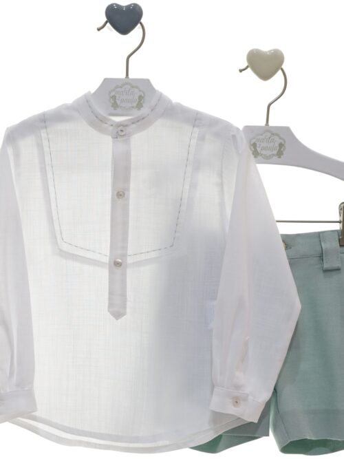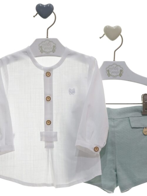 Compleu băieți alcătuit din 2 piese vestimentare: camașă albă din bumbac 100% cu guler rusesc și pantalon scurt din bumbac 100% într-o nuanță de verde pudră. Detalii tradiționale: nasturi maro. Compoziție: 100% bumbac. Produs fabricat în Spania.
